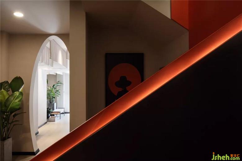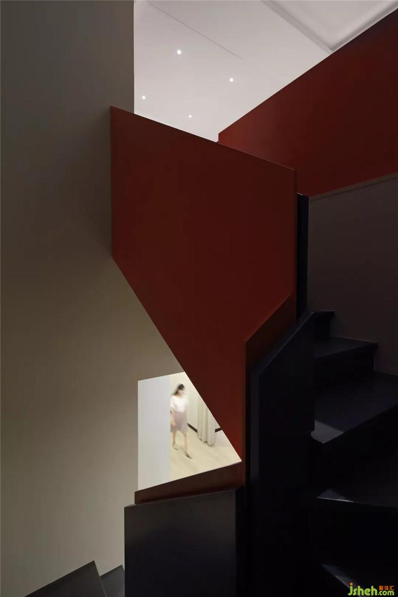 舍去傳統(tǒng)的欄桿扶梯,紅黑搭配的樓梯是樓下樓上色系的銜接色,為樓上房間的色調(diào)做了完美的鋪墊。
