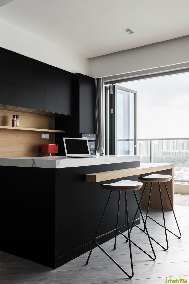 回歸生活,放下忙碌,約二三知己,小酌數(shù)杯,分享屬于在家可感受到的寧靜與愜意;室內設計師使用中島的黑色與木色搭配直接碰撞,太多會比較生硬,咖啡色黑板墻的位置以及面積都起到一個中和作用,它不僅承上啟下,也包容著硬朗的黑白灰之間撞入一份木色暖意,不凝重卻足夠有血有肉。