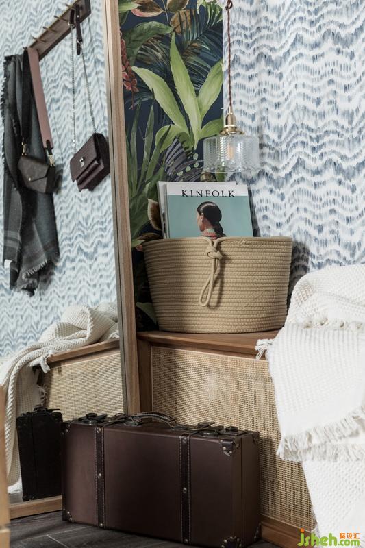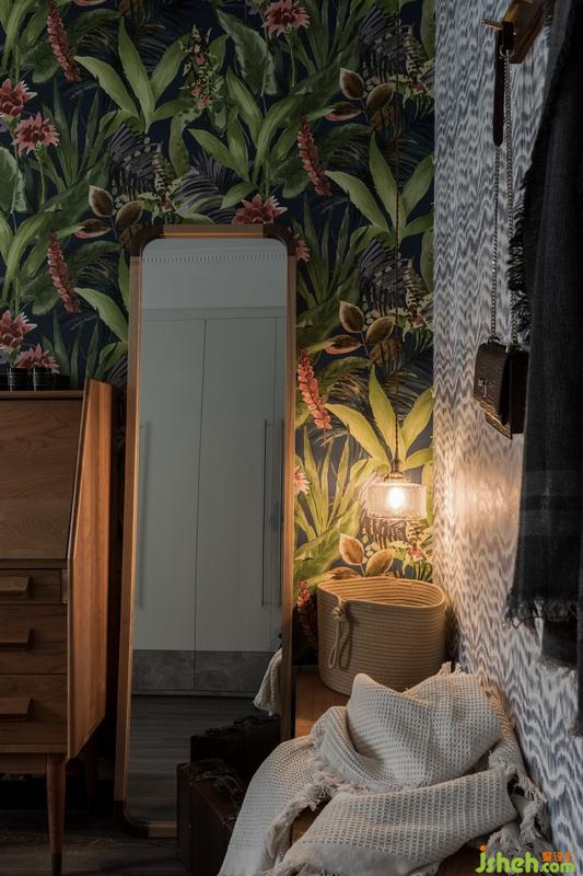 植物墻紙延續(xù)了客廳的叢林感覺,溫潤的櫻桃木在材質(zhì)上將其打破進行對比。