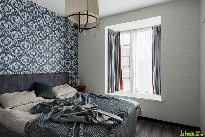 床頭燈溫馨十足,冷色壁紙與暖黃的光暈讓夜晚更謐靜與放松。