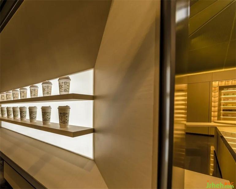 真正置身于內(nèi)部時(shí),一抬頭映入眼的是綠色的異形頂面,仿若一片碩大的葉子,旗艦店設(shè)計(jì)從四周頂立交接處開始由低到高一直延伸到距地面五米處的滅點(diǎn),與頂部最高點(diǎn)的光源完美相接并融為一體。頂部的冷光,配著四周燈帶所散發(fā)出的暖光,使整個(gè)空間層次感和立體感十足,如幻境中的場(chǎng)景一般。