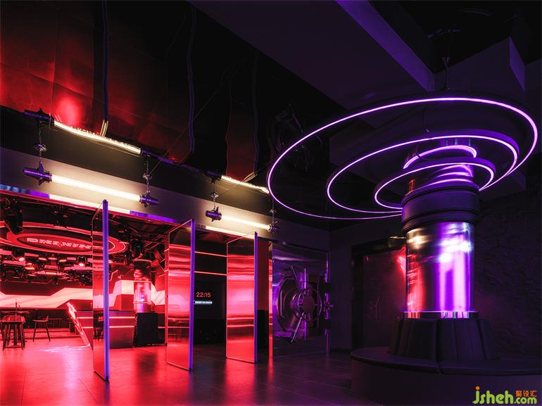 吧臺(tái)區(qū)的LED燈帶利用動(dòng)態(tài)的數(shù)字內(nèi)容快速提升空間氛圍和娛樂趣味,作為點(diǎn)綴的金屬構(gòu)架在霓虹燈的映照下,俱樂部設(shè)計(jì)帶有來自未來的機(jī)械美感。部分吧臺(tái)主體采用玻璃磚堆砌而成,平衡了輕盈與厚重之間的美感,將霓虹光吸納其中。