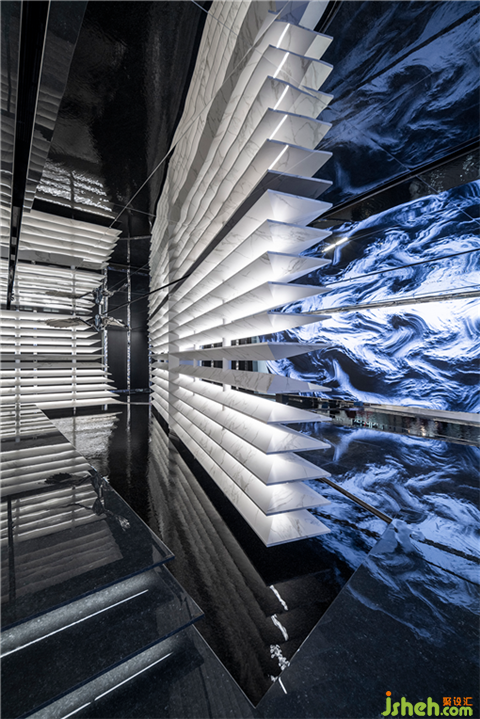 The ink-colored building stands still in the surrounding irregular mapping waterscape, and what makes people stop and watch is the freehand brushwork revealed from the wide windows: the layers of parallel lines are the background, the flexible water ripple texture is an ornament to space, and a long case is used to bring out the theme.