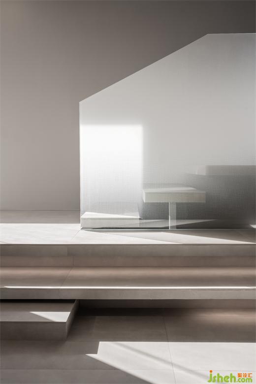 從入口處,經(jīng)過一段狹長的走道后逐漸走入,此時(shí)需要下探幾步才正式踏進(jìn)豁然開朗的開放高挑的室內(nèi)空間,若繼續(xù)拾階而上,可以直達(dá)二樓的會(huì)客茶室之中。