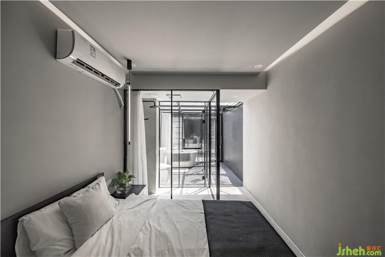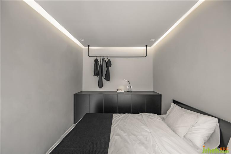 臥室區(qū)域則采用簡約的設計語言,運用黑白兩種色彩,讓空間顯得簡約冷靜,與外側通透靈動的空間體驗感形成對比,給臥室營造一種更加靜謐的感覺。室內裝修