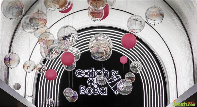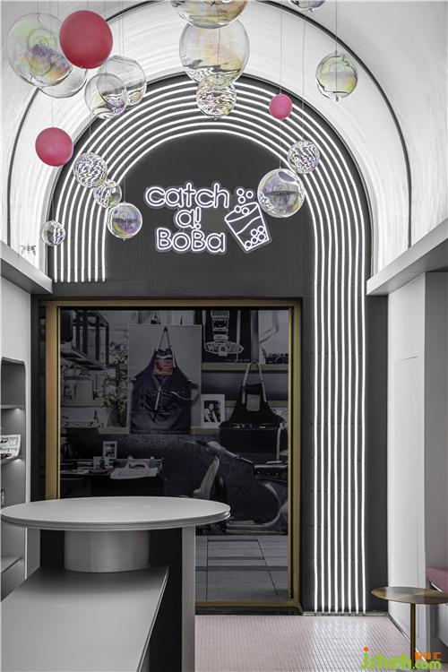 The overall indoor and outdoor logo design has become an important element in space design. We redesigned the logo of catch a boba and added a huge milk tea straw element on the outside of the logo, and the round straw merged with the glowing dome to form the closure of the dome.