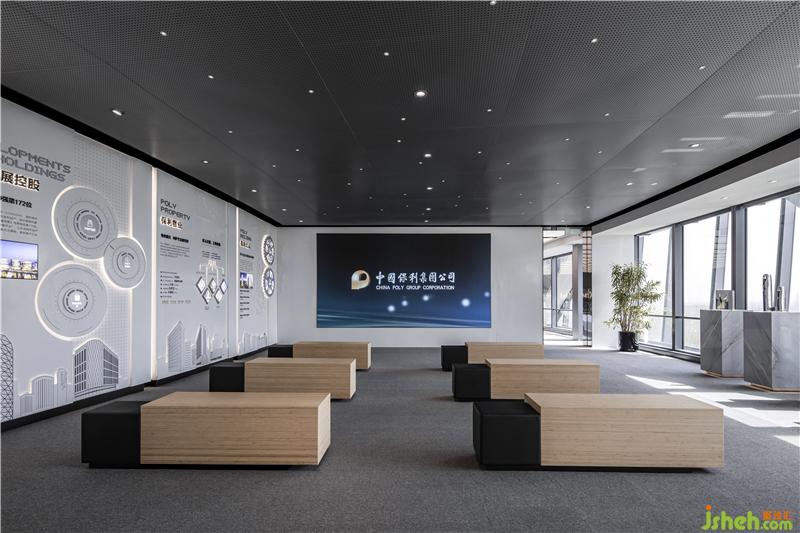 From the light curtain into the front area, the whole space presents a simple and gray sense. In addition to the necessary reception functions of the reception area, a group of display areas are also set up here. In May 2000, Poly Group rescued the three National Treasures of the Old Summer Palace-Bull Head, Monkey Head and Tiger Head-bronze statues that were plundered by foreign powers more than 100 years ago, and returned to China, which aroused widespread acclaim at home and abroad and inspired the patriotic enthusiasm of Chinese. On the side of the reception area, there are four bronze beast heads from the Old Summer Palace collected by Poly Group. These artistic treasures are also a symbol of the light of national culture.