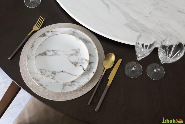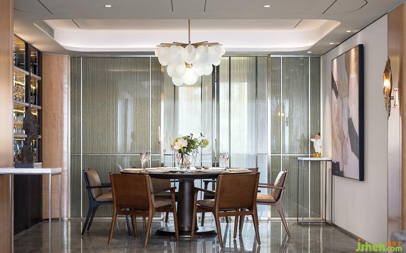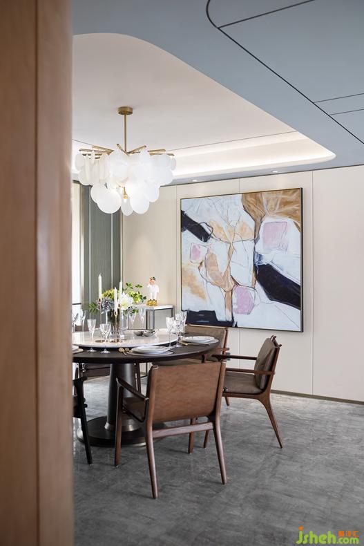 餐廳儲(chǔ)物柜加粗豎向線條分割大空間,細(xì)化直線構(gòu)造出三維層次感,對(duì)應(yīng)墻面的巖石抽象藝術(shù)畫,實(shí)用性與藝術(shù)觀賞性俱佳。