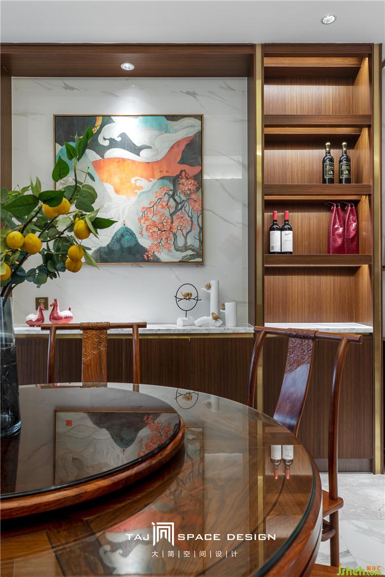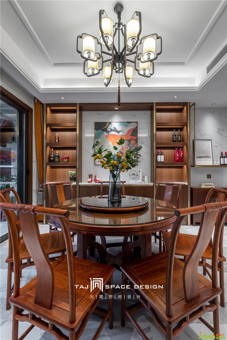 有“味道”的新中式餐廳,以當代手法演繹,注重實用的實用性,并將人文情懷注入平常生活。餐廳的空間室內設計師以圓桌為中心將周遭輻射成一個圓形環(huán)繞動線,使得餐廳更加富有創(chuàng)意而不呆板,厚重實木的餐桌則體現了中式的大氣沉穩(wěn),與客廳的意境相得益彰。
