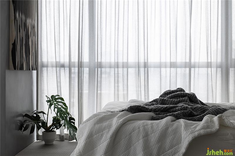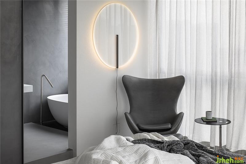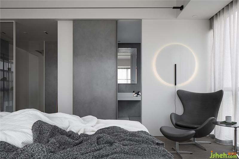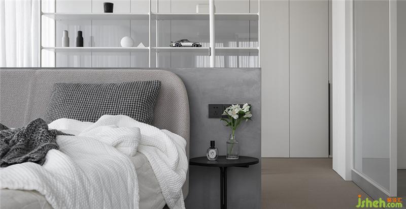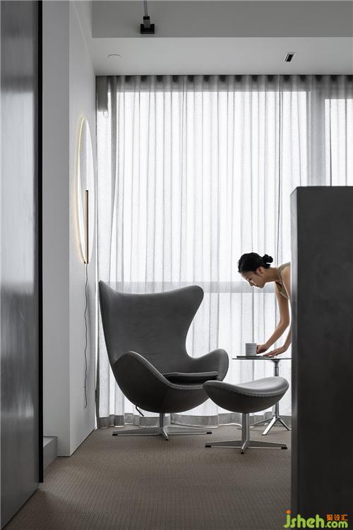 混凝土體塊充當(dāng)床頭背板,懸浮于工作與休息空間之中,在低飽和度灰調(diào)的鋪敘下,北京室內(nèi)設(shè)計(jì)師帶來了微妙而柔和的空間過渡。