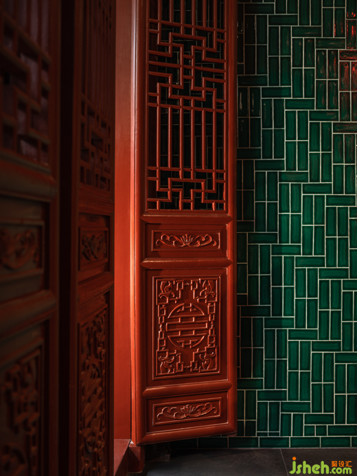 火鍋店設(shè)計(jì)以中式的裝修藝術(shù)風(fēng)格為主的墨綠的瓷磚與窗牖的格紋,表達(dá)了對(duì)傳統(tǒng)文化、復(fù)雜工藝的迷戀,和工業(yè)時(shí)代的簡(jiǎn)煉。