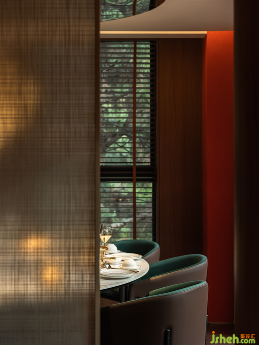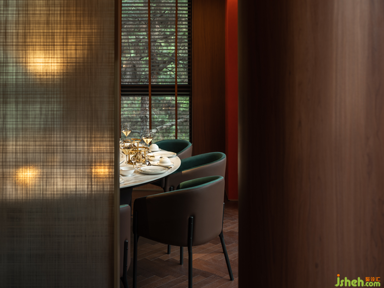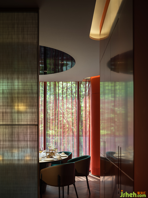 包廂延續(xù)了新古典浪漫主義,厚重的隔斷與紗帳,帶來夢里看花的朦朧美感?;疱伒暝O計師以材料、色彩、器物、藝術等諸多方面入手,為現(xiàn)場營造出精致、優(yōu)雅、奢華的氛圍感。