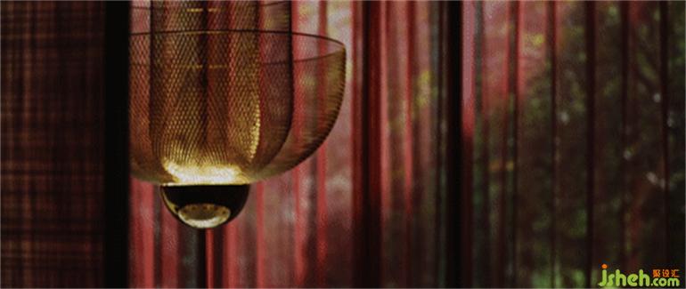 與弧形墻面相呼應著的金色網(wǎng)格的吊燈,成為了空間視覺的焦點?;疱伒暝O計師將一種最基礎的材料——黃銅,轉(zhuǎn)變?yōu)橐环N工業(yè)詩意的美學。他摒棄了黃銅的笨重、陳舊和剛強,展現(xiàn)出它輕盈、柔韌和古典的一面,以此與紗帳相呼應,空間透過它的紋理和無數(shù)細密的網(wǎng)格交織、靈動起來。