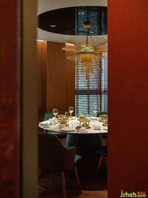一層六人包間高高的天花上懸掛著枝形黃銅吊燈,如扇如萍,散落在整個(gè)空間中。自然之美抽象融合,在雕梁畫棟間飛揚(yáng)綺麗,熠熠生輝。