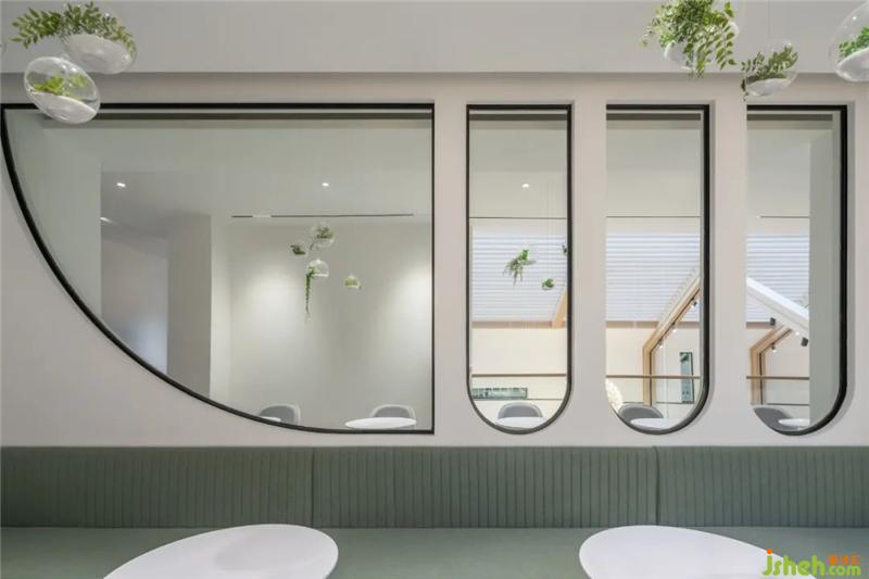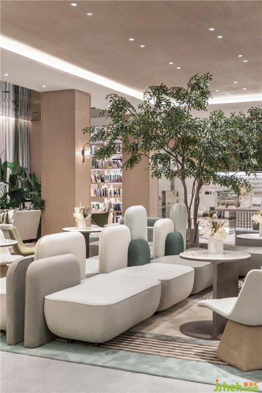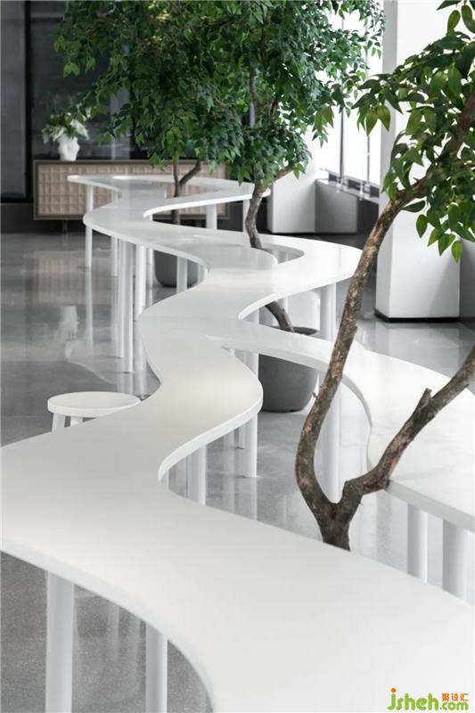 綠植裝置與墻體生長(zhǎng)在一起,波紋玻璃粼粼閃光,在平滑中過(guò)渡出的座椅線條與弧度,成為空間藝術(shù)氣質(zhì)的重要構(gòu)成元素,與純白的基調(diào)相融相深圳營(yíng)銷中心設(shè)計(jì)協(xié)調(diào)。