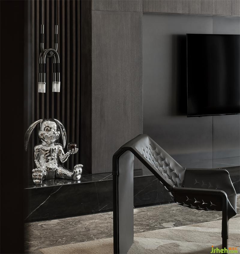透過窗戶灑下的光影渲染獨(dú)具特色的空間韻律,半包圍的沙發(fā)Lawrence “Clan”元素采用現(xiàn)代圖形拼接設(shè)計(jì),賦予構(gòu)圖更具動(dòng)感的韻律,并為客廳裝飾營造沉穩(wěn)而不失奢華的低奢交談空間,摩登端雅兼具美學(xué)內(nèi)涵。