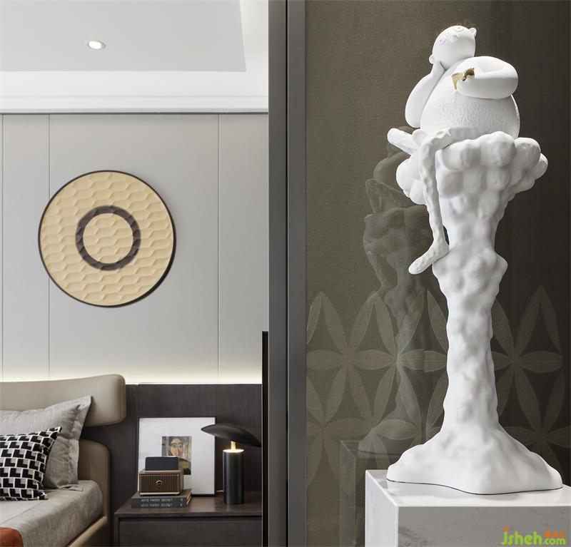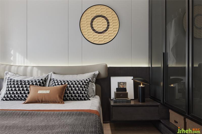 主臥延續(xù)空間的設(shè)計(jì)基調(diào),像是眼影盤中常被稱作大地色系,經(jīng)典而聞名,精致而優(yōu)雅。墻面的皮革畫是臥室空間的視覺焦點(diǎn),家具和飾品的擺設(shè)恰到好處,通過材質(zhì)的本質(zhì)賦予空間的深度和溫度,營造了沉穩(wěn)內(nèi)斂的場域。