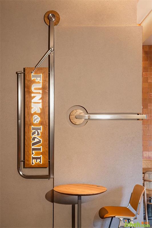 作為Wagas旗下的成員,F(xiàn)UNK & KALE主打高顏值的西式健康餐,空間跟隨其品牌概念的衍生是想通過(guò)功能性裝置打破當(dāng)下普遍“和諧”就餐環(huán)境體驗(yàn),通過(guò)觀展體驗(yàn)的方式對(duì)空間構(gòu)造進(jìn)行組合設(shè)計(jì),用嚴(yán)謹(jǐn)?shù)膸缀沃刃騺?lái)構(gòu)建感性的場(chǎng)域。