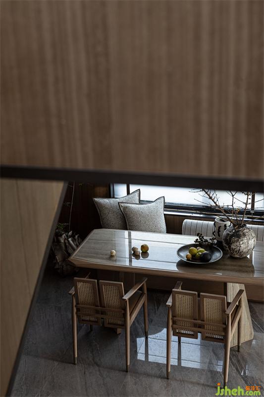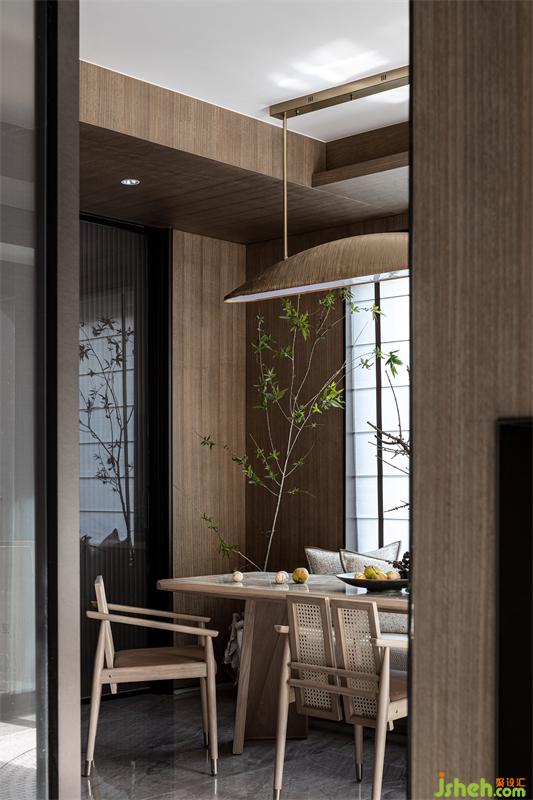 多人餐位餐椅圍合木質(zhì)方桌,一抹綠意清晰淡雅,樣板房設計打破平靜素性的視覺平衡,微透光源的柵欄窗,光線溫暖而空靈,發(fā)出呼吸的聲息,賦予餐飲空間有機生命的感知,留下對生活理解的新鮮印記。