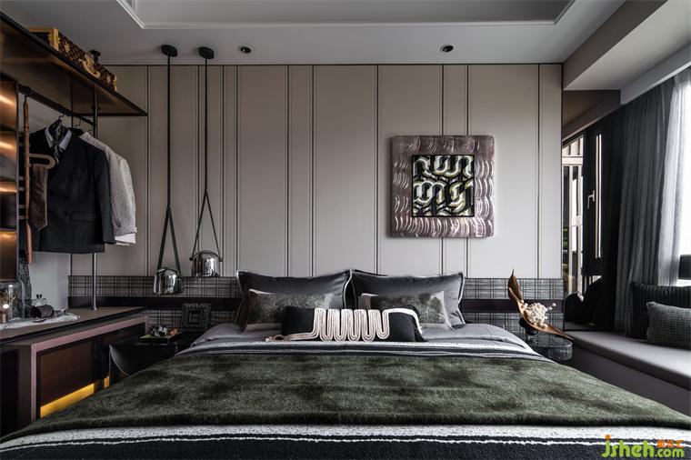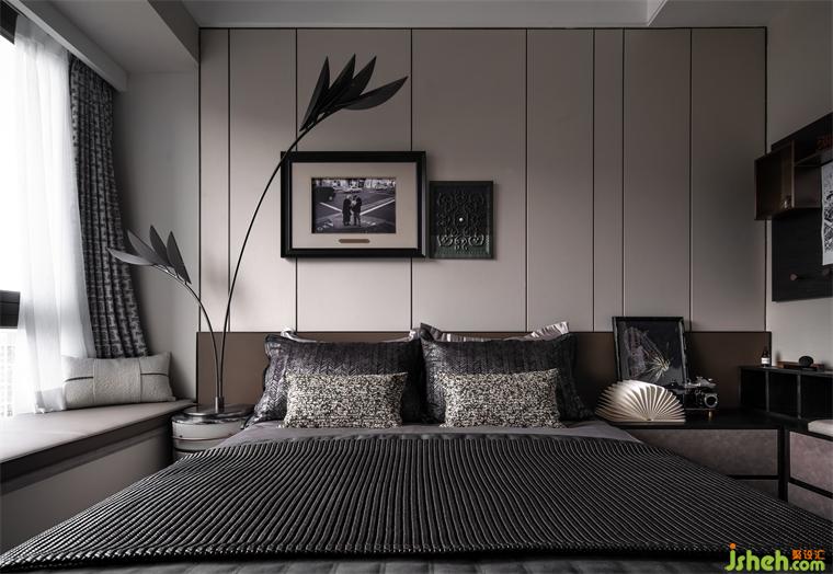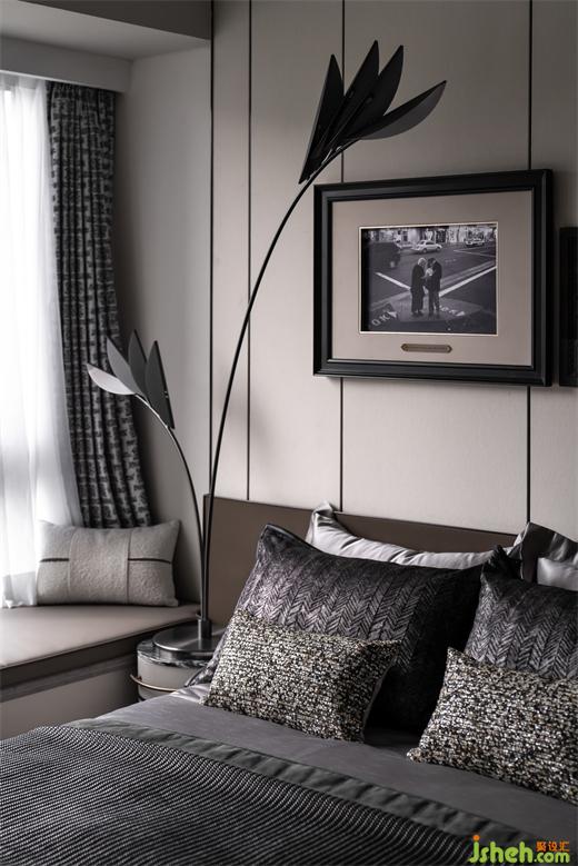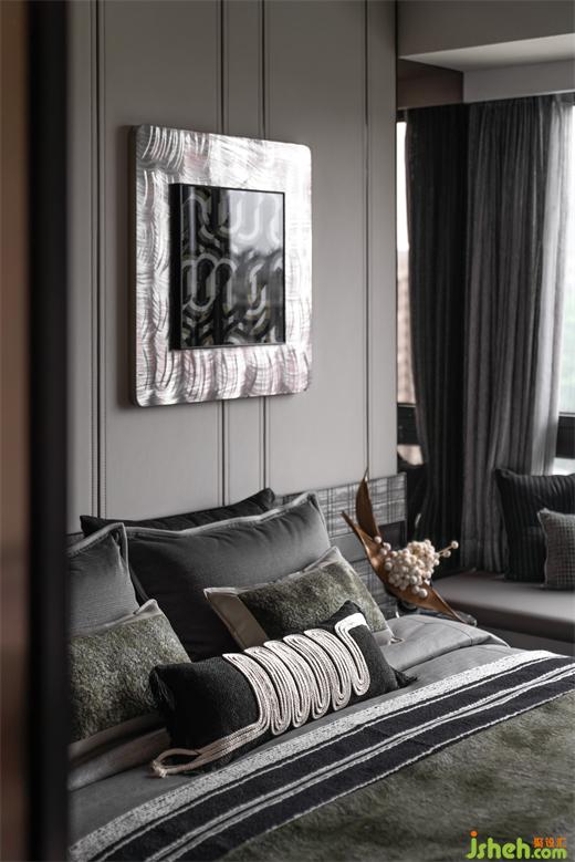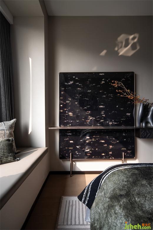 主臥更像是主人的一隅獨立天地,裝飾畫提取嶺南特色建筑經(jīng)典元素— —鑊耳屋結構進行重構,樣板房設計帶著對文化和記憶的共情、與時代生活的包容力,成就一方嶺南風情天地。
