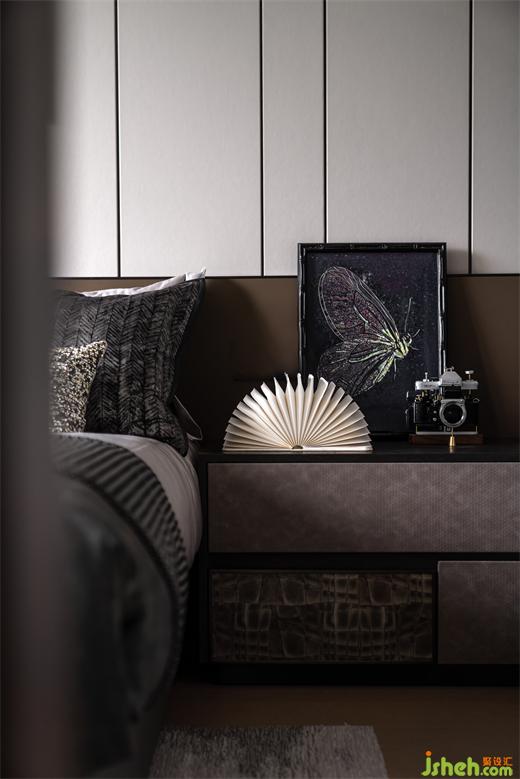 考慮到男主人品鑒和收藏的需求,設計師弱化了餐廳的邊界,樣板房設計增加了可供收藏、收納的餐邊柜,轉(zhuǎn)換為休閑家庭迷你吧。