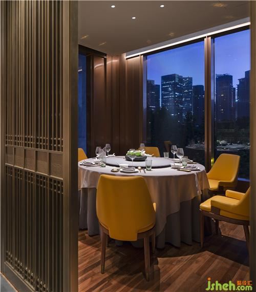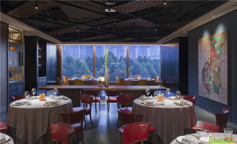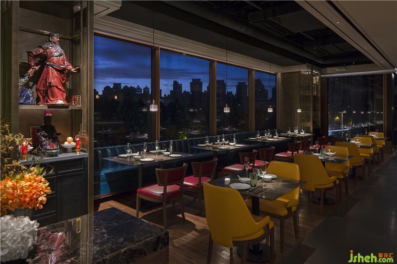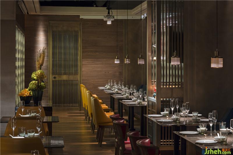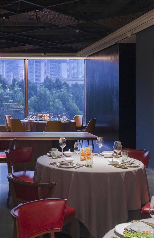 運(yùn)用山水畫(huà)中的平遠(yuǎn)觀法,使長(zhǎng)條落地窗正好引入江景,橫向排布的餐桌為第一層、窗外樹(shù)木為中間層上海餐廳設(shè)計(jì)、CBD高樓為外層,層層推遠(yuǎn),模糊了空間的界面,擴(kuò)寬了視野。