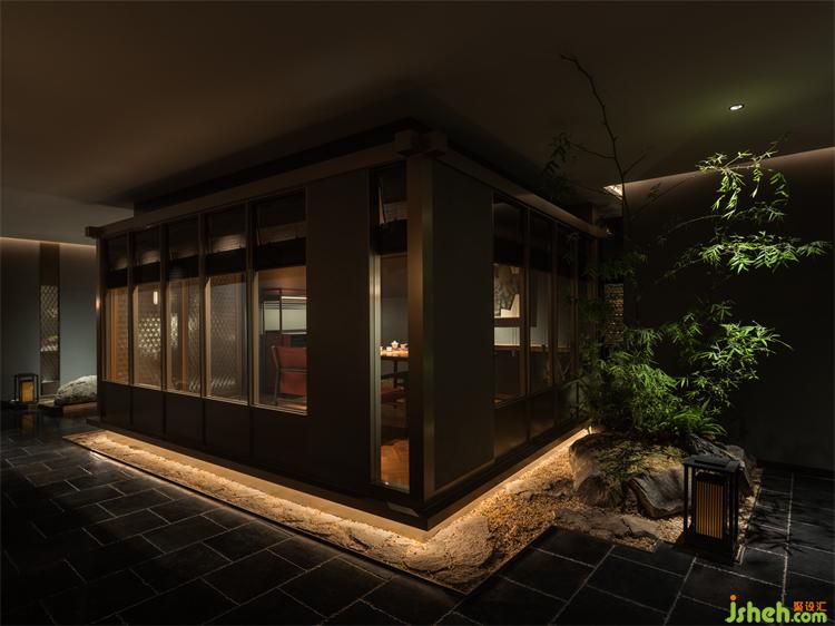 四周碎石鋪地,長燈環(huán)繞,如臨空起,借水榭形式,龍吟九品餐廳設(shè)計(jì)配以落地長窗,兩面借景,雖在城市而得山林之樂。