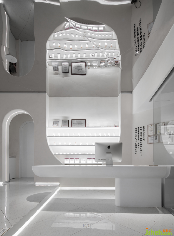 接待臺(tái)的圓角、空間內(nèi)分布的各種倒角的元素呼應(yīng)品牌主題福州店鋪設(shè)計(jì)