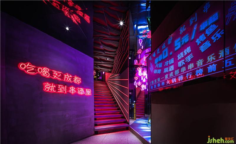 進(jìn)入大廳,空間感上強(qiáng)烈的折線造型以串串的造型為靈感,在有限的空間里,折線造型的紅色的燈光照射著四面八方,讓成都紅紅火火的景象感染著食客們。不同的折線造型代表著不同的串串形態(tài),南京餐廳設(shè)計食客們被這些與眾不同的造型所吸引,有種恍如隔世的地域特色,帶著濃濃的巴蜀風(fēng)味。一把把大提琴的雕塑仿佛在奏著樂,音符充斥著整個大廳。其背景是五光十色的背景板。愛心和音符的掛件擺放在天花板上,燈光和軟裝部分加重了力度,讓彩色的光線成為第一設(shè)計元素,這樣做既能減少投入,也能營造出讓人印象深刻的感覺。