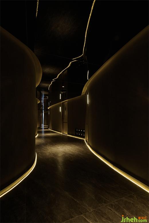我們在空間中打造出只能看見“光”,卻看不見“燈”的效果。所以不僅僅是燈光設(shè)計(jì),也是明暗的設(shè)計(jì),走在過道上,仿佛置于一個被海水包圍的輕松感,讓禪意之美與情韻在視線延伸中娓娓道來,步移景異。