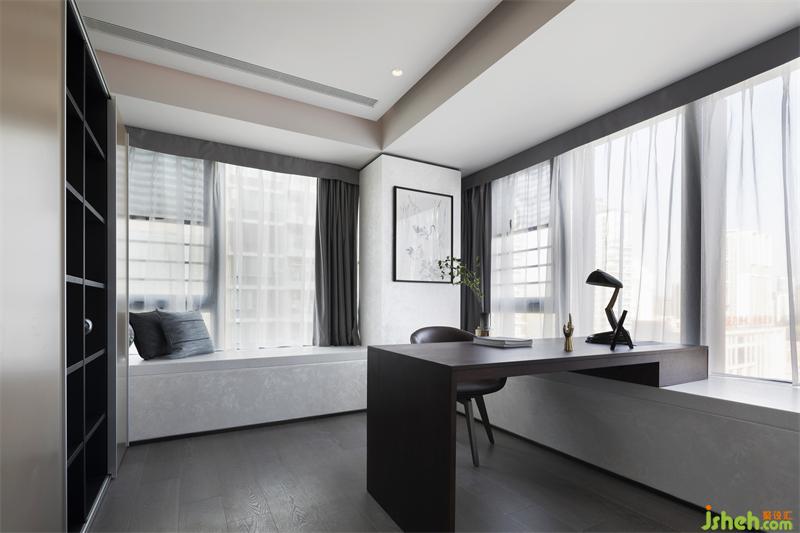 書房是男主人的私人領(lǐng)地,同樣延續(xù)空間的主色調(diào),私宅設(shè)計師創(chuàng)造了一個與世隔絕的獨(dú)處空間它不僅僅是一個書房也是一個靜謐的、自我治愈的冥想空間。