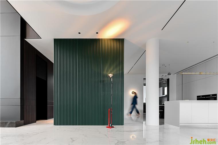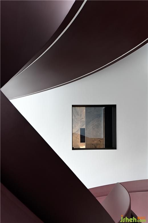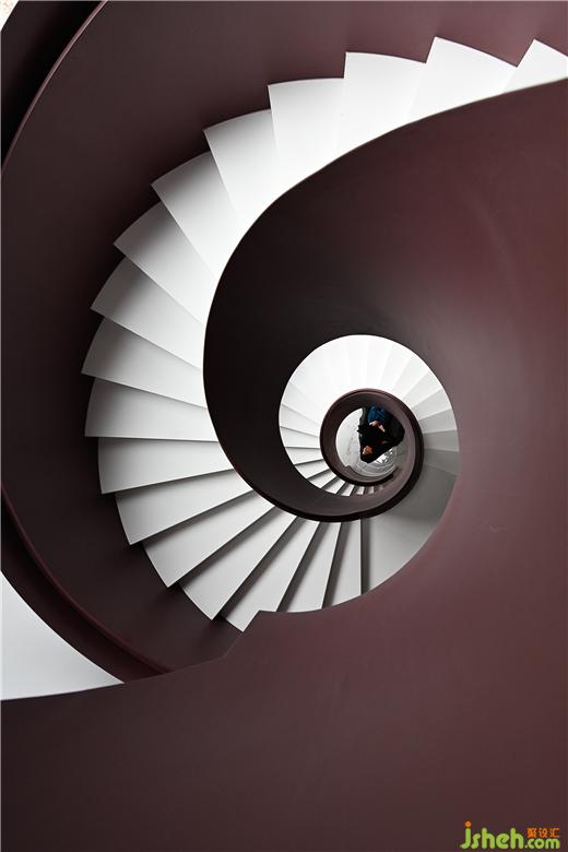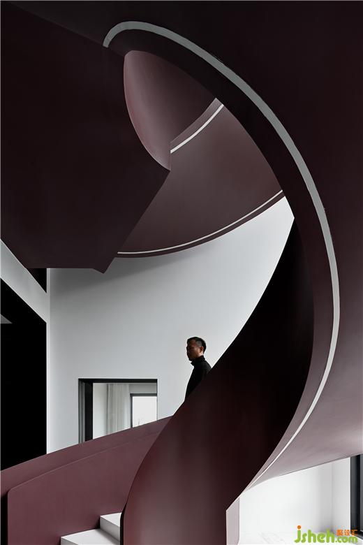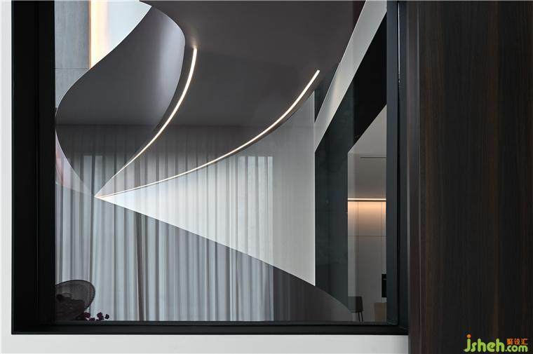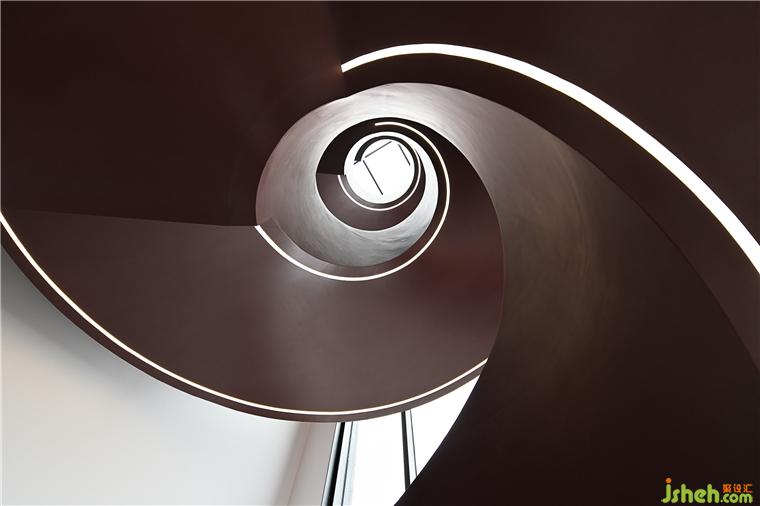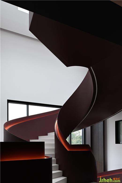 樓梯間位于中心幕墻的正后方,別墅裝修設(shè)計從一層筆直通往屋頂,光線通過樓梯間的垂直落地窗投射在旋轉(zhuǎn)樓梯上,所形成的陰影在一天中變化多端。