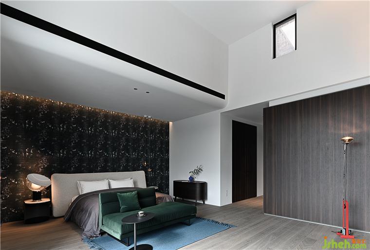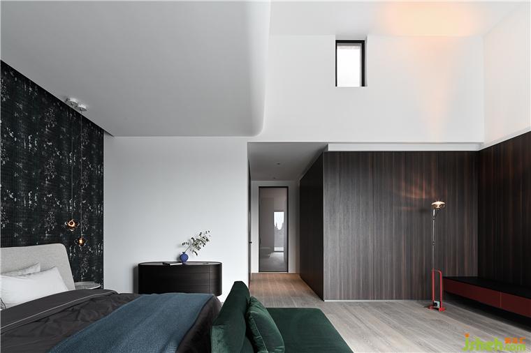 別墅裝修設(shè)計(jì)住宅臥室位于二層和三層,低飽和度色調(diào)營(yíng)造出平靜安逸的情緒空間。房間擁有遼遠(yuǎn)視野與充沛陽(yáng)光。主臥床后的背景選Wall&decò的做舊紋理墻紙,中間穿插湖綠色的紋路,好像是老建筑遺留下的一堵墻,對(duì)空間故事線(xiàn)再次做出提示。