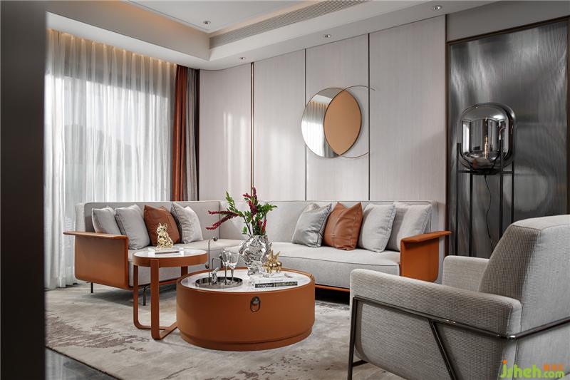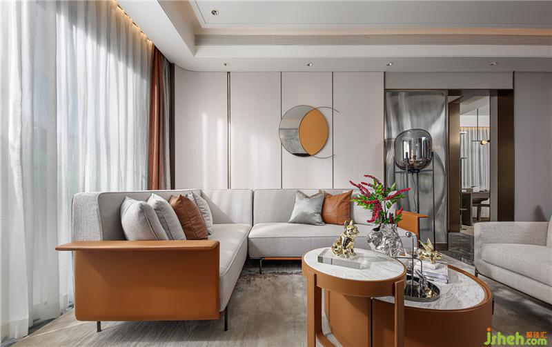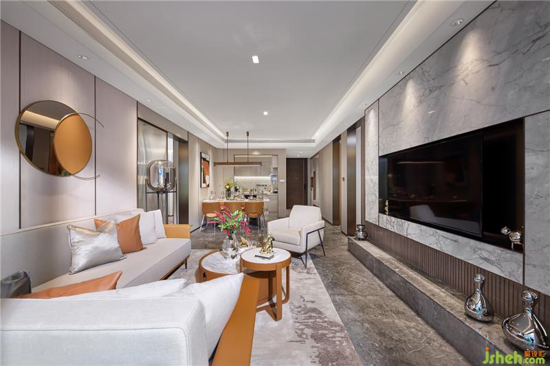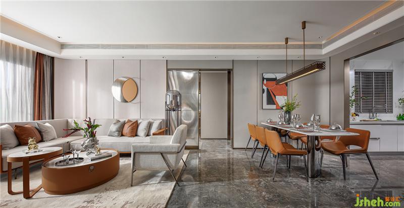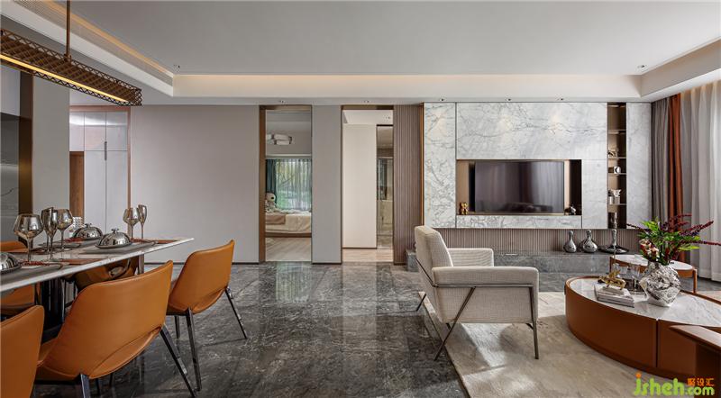 如果說(shuō)140戶型的風(fēng)格更迎合潮汕風(fēng)俗的話,那這套125戶型則更具年輕的都市現(xiàn)代時(shí)尚。去風(fēng)格化與品牌感,現(xiàn)代輕奢與小確幸的細(xì)節(jié)體現(xiàn)。同樣,揭陽(yáng)樣板房設(shè)計(jì)與140戶型點(diǎn)綴的紅不一樣的,這套以橙為點(diǎn)輟色,更為年輕與時(shí)尚。橙色與皮質(zhì)的搭配會(huì)有很強(qiáng)的品牌感,試問(wèn)哪個(gè)年輕人不喜歡品牌。