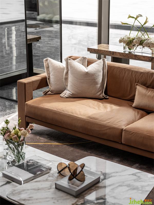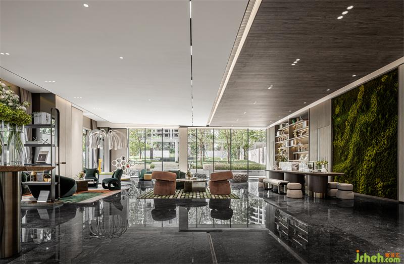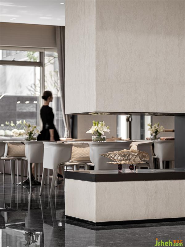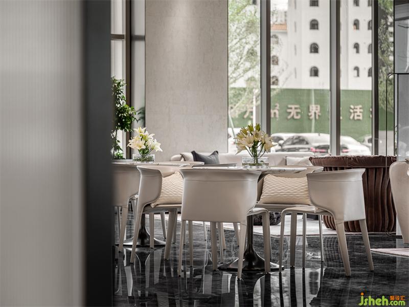 在這個(gè)停留時(shí)間最長的區(qū)域,營銷中心設(shè)計(jì)運(yùn)用了平滑與粗糙肌理的材料對比,米白啞光天花與原木條天然紋路天花、多層次的墻面造型穿插以簡潔石材、磨砂鏡及拉絲古銅鋼材等等的立體構(gòu)成,以這樣的穿插與對比,有節(jié)奏地融合在一起形成有張力但不會(huì)生硬的空間格局,加上壓于全場地面的奧地利灰亂流紋路大理石,烘托出充滿時(shí)尚活力又成熟穩(wěn)健的人性空間氣場與溫度。