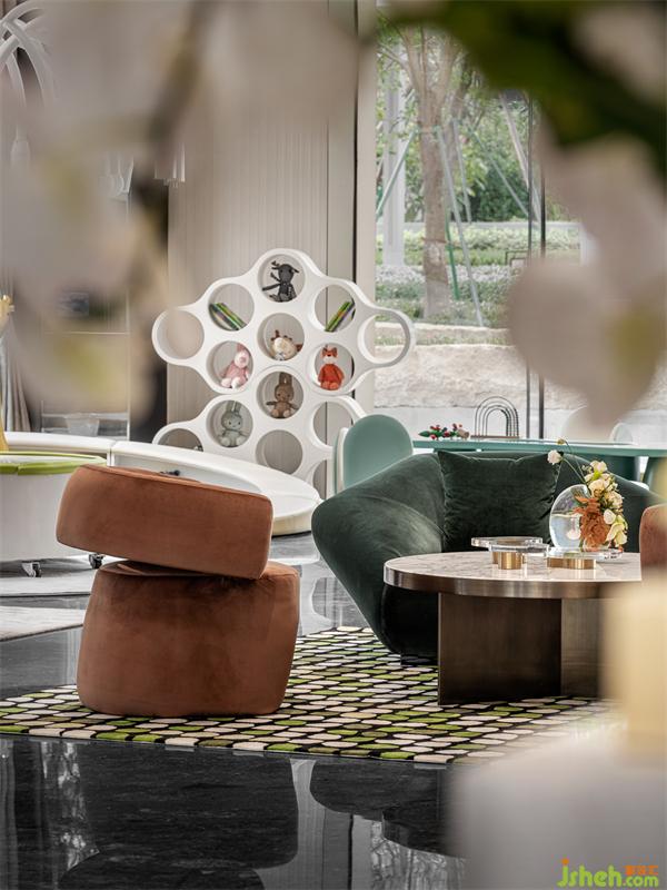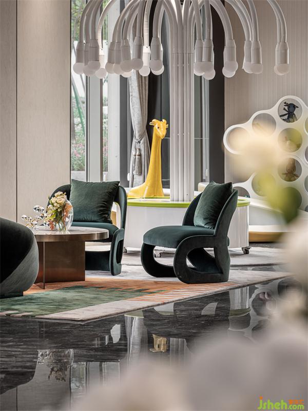 參觀客戶的長(zhǎng)輩們?cè)谙硎荏w驗(yàn)百萬級(jí)的意大利沙發(fā)組合的同時(shí)孩子們已經(jīng)被五彩繽紛及香氛氣泡樹吸引,這正是本項(xiàng)目的情景區(qū)間:“奇幻夢(mèng)童話”,這里點(diǎn)石亞洲藝術(shù)組重新探索高段位的童趣空間,事實(shí)證明它不單打動(dòng)了童趣的孩子們,也把家長(zhǎng)們長(zhǎng)期被壓抑的色彩認(rèn)知捅破,即并非黑白灰色調(diào)才是高范,營銷中心設(shè)計(jì)講究人情并使用非傳統(tǒng)的色彩更能挑動(dòng)潛意識(shí)內(nèi)的對(duì)純理性及功利主義的反叛,喚起失去的好奇心,以同理心感受孩子們的歡愉。躺在墨綠色絲絨的CORNELIO CAPPELLINI沙發(fā)上,完全有放縱的“躺平”沖動(dòng),這便是博物館級(jí)意大利家具的魅力所在。以意大利現(xiàn)代名畫為藍(lán)本的原色系列羊毛地毯、在美國邁亞密海灘派對(duì)最流行的幻彩霧泡泡樹,把夢(mèng)幻氣氛再推上一個(gè)驚喜高潮?!捌婊脡?mèng)童話”把后現(xiàn)代主義的個(gè)人浪漫情懷,賦上熱愛自然、品味高雅的詩意童趣,強(qiáng)調(diào)尊重人性內(nèi)在欲求及好奇心,突出關(guān)注人性中矛盾對(duì)立的潛在內(nèi)涵。
