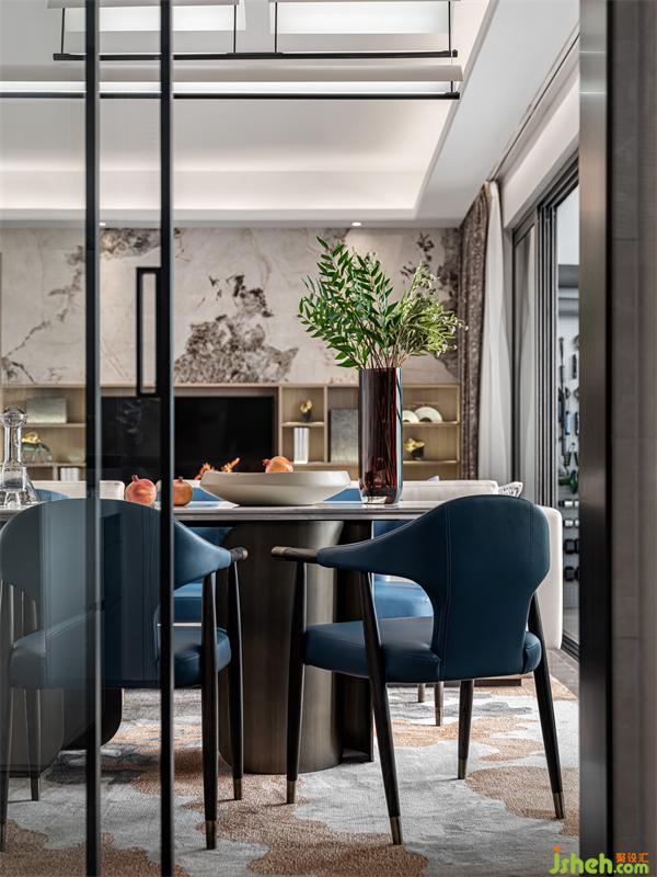 大橫廳的空間設(shè)計,得以上餐廳不再局促,客廳的無主燈設(shè)計,給了餐廳創(chuàng)意吊燈的空間,精致的餐臺,大理石臺面結(jié)合不銹鋼雙圍合式臺腳,搭配精工細(xì)節(jié)的餐椅,所有的種種,都是一種人生的態(tài)度,餐椅近乎靛藍(lán) 的跳色,更是一份與生俱來的優(yōu)雅情懷。