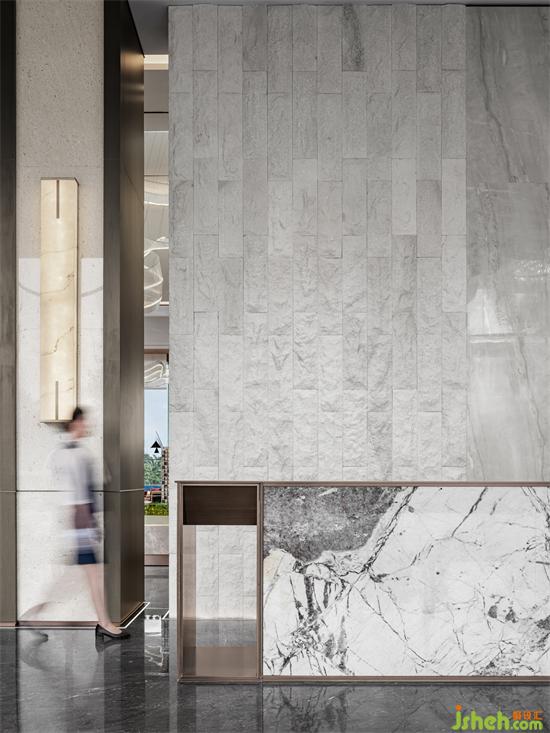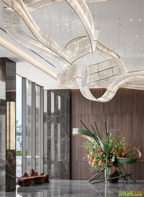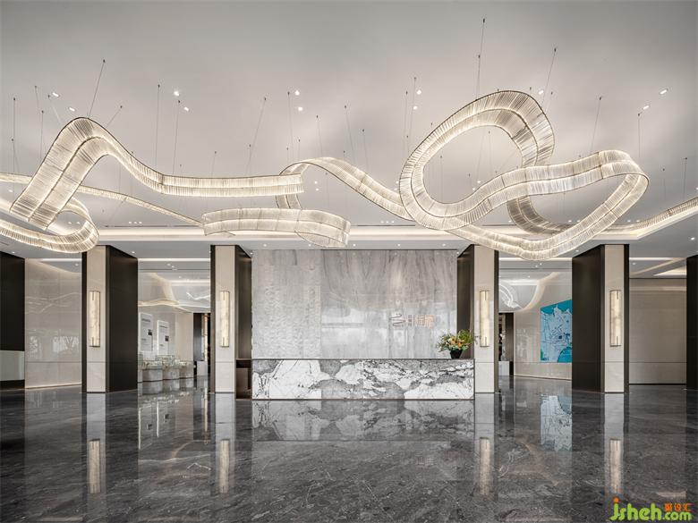 融合現(xiàn)代建筑感的有序節(jié)奏排柱,招商體驗中心設(shè)計結(jié)合自然的材質(zhì),形成一種步入式的儀式感從海岸線的形態(tài)中找尋靈感,將抽象與具象并存相糅合,配合接待區(qū)門口的兩張藝術(shù)曲線長凳,燈與家具使得靈動與寧靜,粗獷與纖柔相呼應(yīng)。