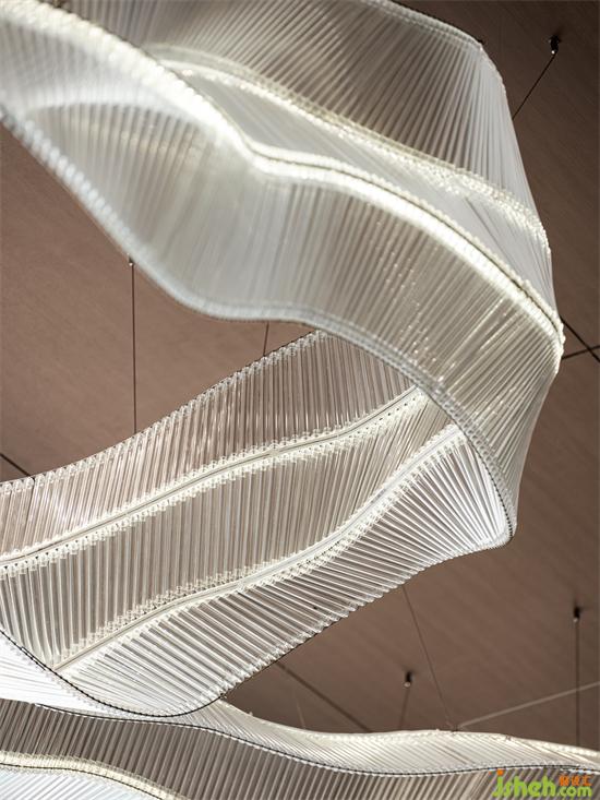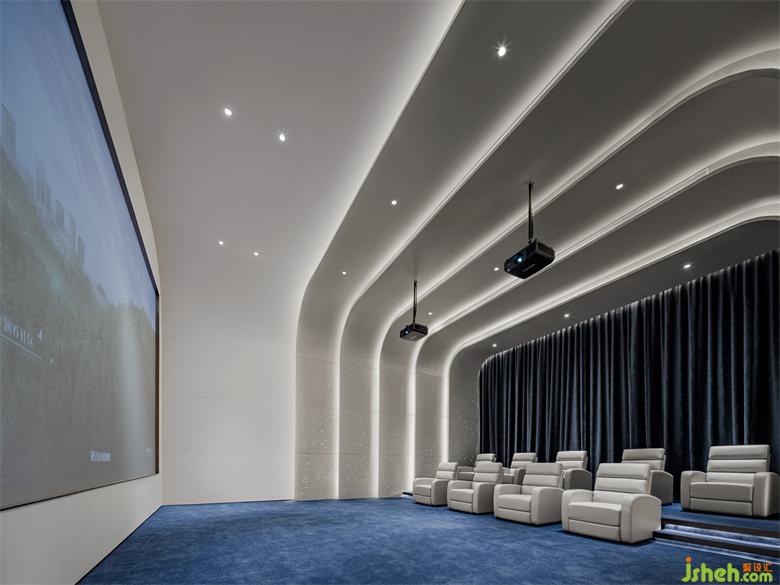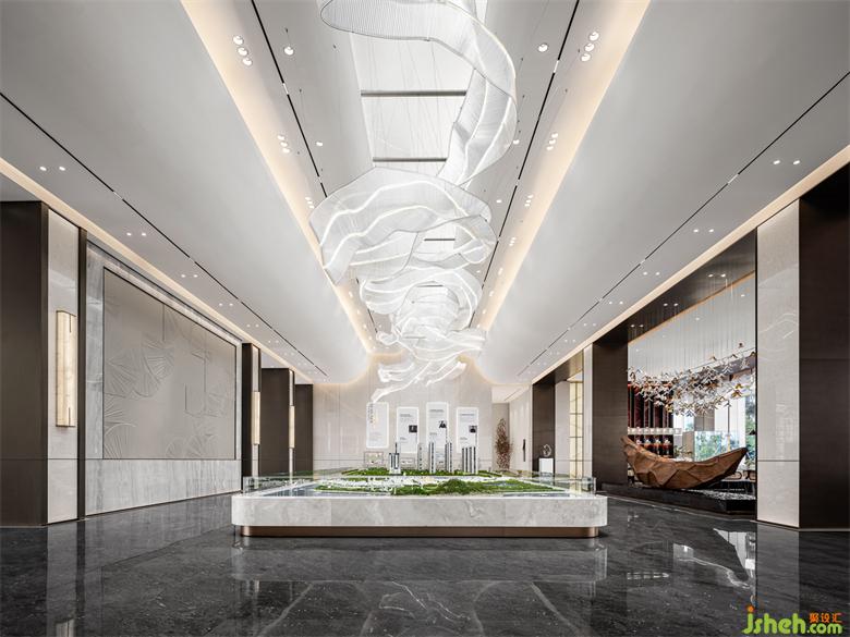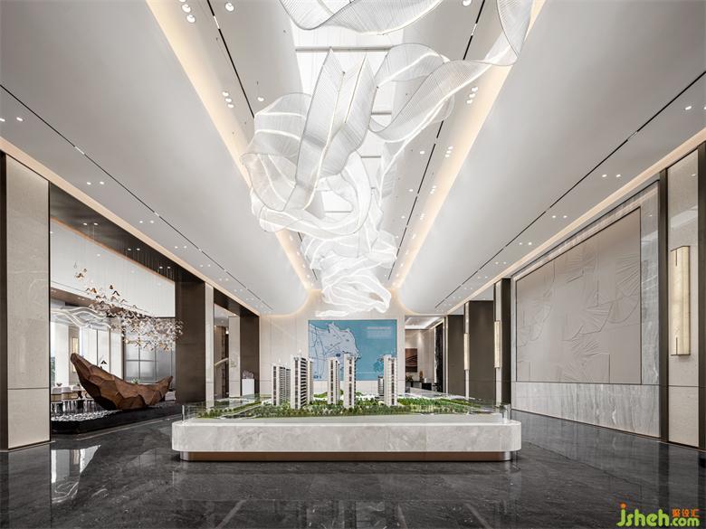 整體空間結(jié)合採光井體現(xiàn)空間尺度感。招商體驗中心設(shè)計引天光入室的設(shè)計完美的與光互動,納天地之韻律·利用天花燈飾的震撼造型將自然光灑在建筑沙盤上,太陽的升起或落去,不斷地循環(huán)往復(fù),在不同的時空,有著不同的渲染場景。