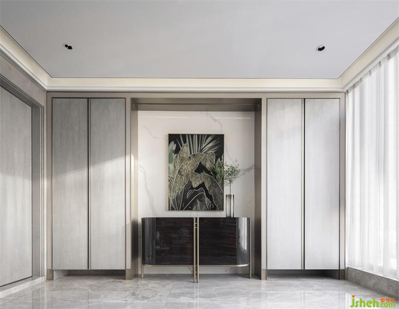 整個(gè)項(xiàng)目大致分為公共區(qū)域和私人空間,一層主要是公共區(qū)域,玄關(guān)、客廳、餐廳、吧臺(tái)以及廚房。入戶玄關(guān)往往不需要太多的裝飾、一個(gè)玄關(guān)柜、一幅琺瑯琉璃畫(huà),再搭配清新的綠植就足夠讓人感受到整個(gè)空間的氣質(zhì)。