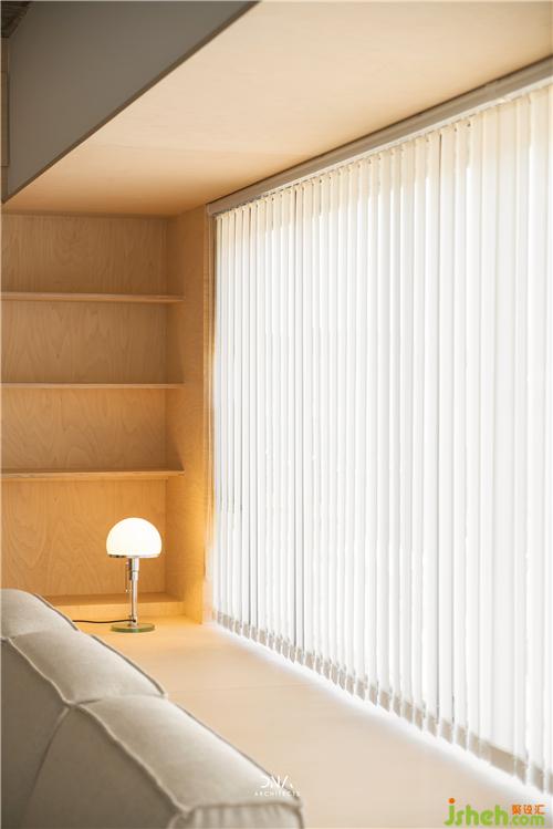 ▼開放書柜以窗臺的延伸形態(tài)呈現(xiàn),更加自然地處理兩個立面的轉(zhuǎn)換關(guān)系。