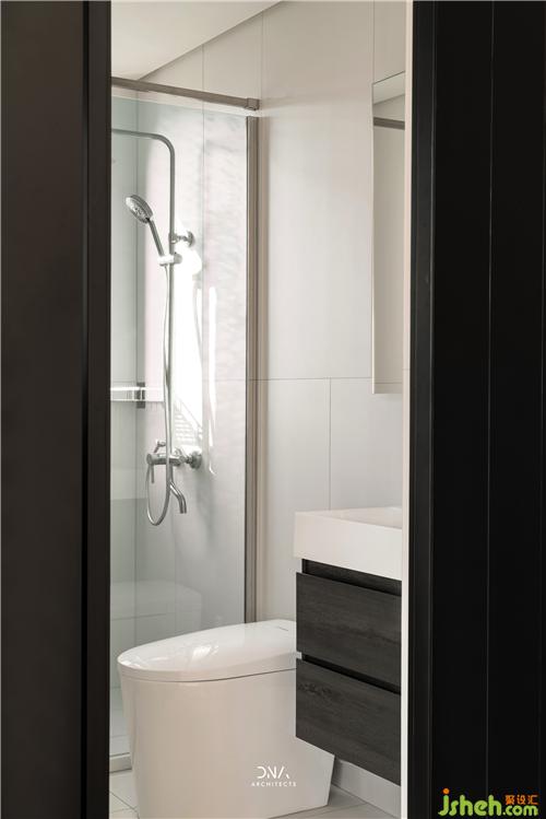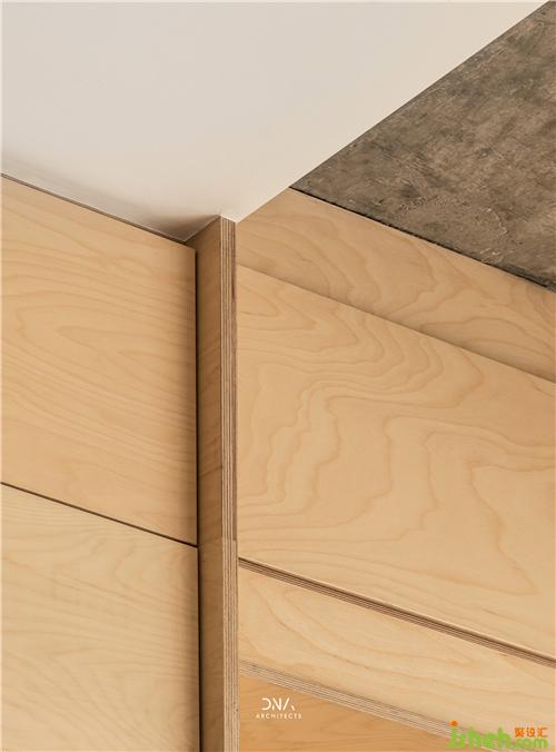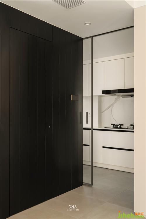 ▼通過黑、灰色兩個塊面之間形成通往廚房的入口,頂面暗裝移門軌道來保持簡潔的設計語言。