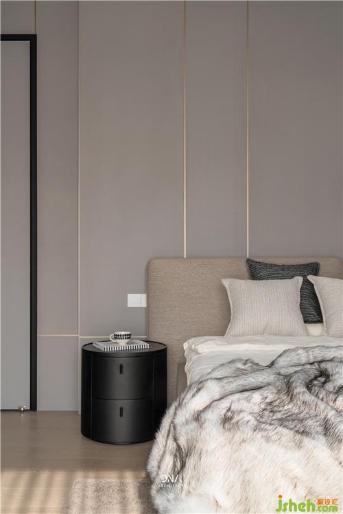 書房作為半公共空間,整體材質(zhì)與客餐廳保持一致。而臥室選用更加柔和的布紋護(hù)墻,軟裝以藍(lán)色裝點(diǎn),增加靜謐的色彩情緒。