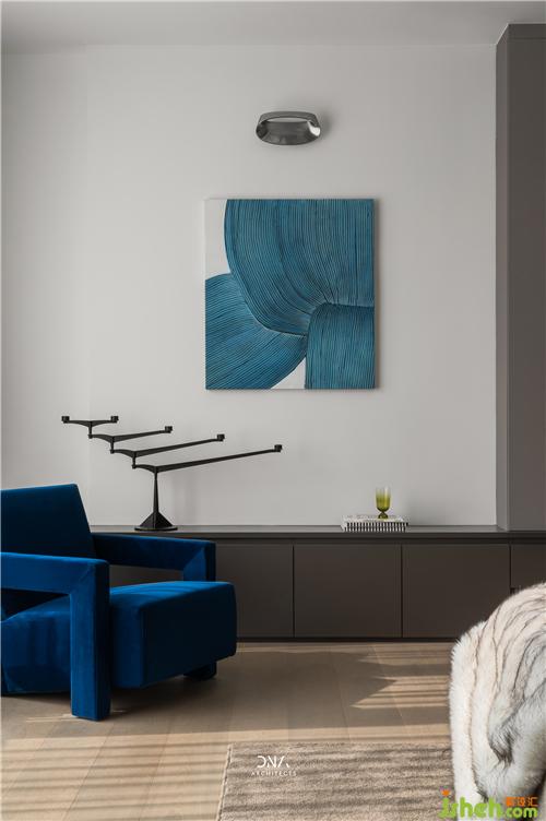 The study serves as half public space, integral material is consistent with guest restaurant. But the bedroom chooses downy cloth grain parapet, soft outfit design increase quiet colour mood with blue embellish.