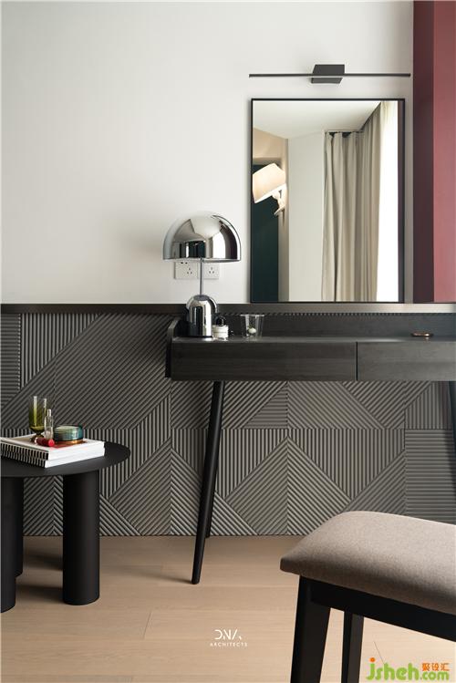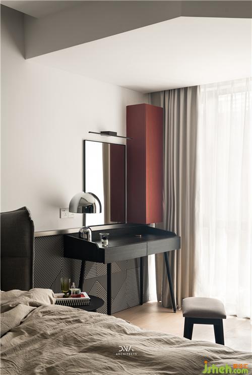梳妝臺處紅色與黑色的色彩對比,增加空間的層次感。