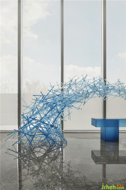 這個概念具象化的簡潔設(shè)計頗具試驗性,表達(dá)出設(shè)計師的野心:裝置主體是一處功能與形式相統(tǒng)一的碧海長凳,可供觀者坐臥;圍繞長凳,設(shè)置出藍(lán)白漸變、拋物線形的堆疊“西山木石”,企圖填滿空間大理石地面所代表的“浩瀚東?!?。“海天一色,互融互補(bǔ)”裝置與倒影相輔相成,成為一幅完整的“精衛(wèi)填海圖”。