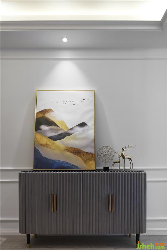 純潔的白色作為空間主體色,搭配簡潔利落的線條,沒有過多的裝飾,采用孔雀藍搭配橙色為客廳增添濃郁的色彩與背景裝飾畫相呼應。室內(nèi)設(shè)計師
