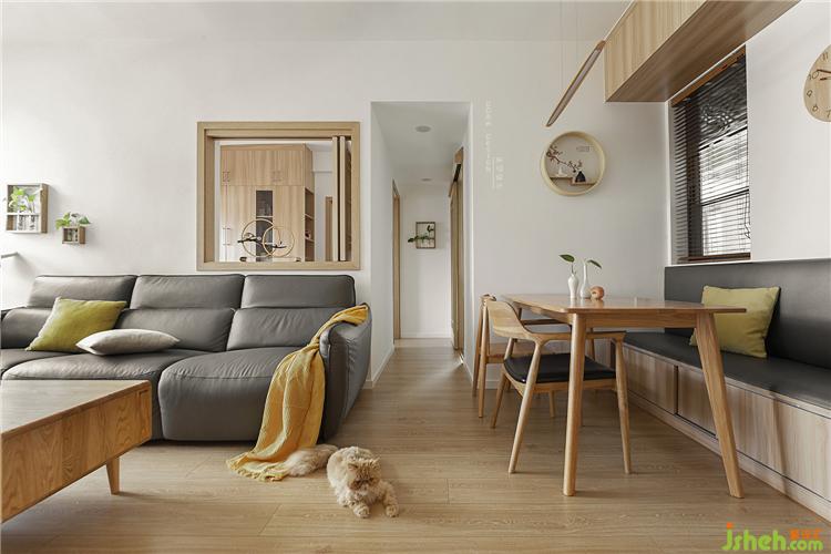 “打開心靈的窗戶,迎接一米陽光”,客廳電視墻的設計就更有意思了,設計師將廚房進客廳的門洞設計成一扇通透的推拉門,它不但是區(qū)分廚房與客廳的一扇門,更是一個襯托出日式風的造型背景,我們叫它“靈性”門。室內(nèi)設計師