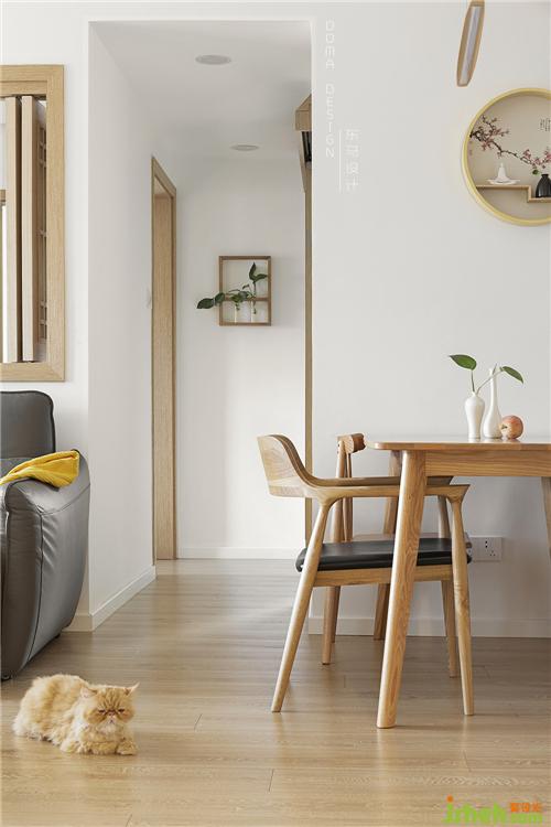 勘測時發(fā)現(xiàn)樓層高度低、改造可能性比較大,但裝修資金又有限,房子設計主要是以父母居住為主,還有一只陪伴了十幾年的家庭成員(貓寵),自己周末會來小住。考慮到父母居住,木色能夠更好地營造溫暖的居住空間,因此木色系的設計風格成為首選。父母年紀大了,在大城市里的生活環(huán)境老人家更希望是休閑放松的居住氛圍,通透又便于家人間親密交流,活動性較大、流動性的空間,更好地頤養(yǎng)天年。同時貓也可以隨處走動,隨處可見其身影。室內(nèi)設計師