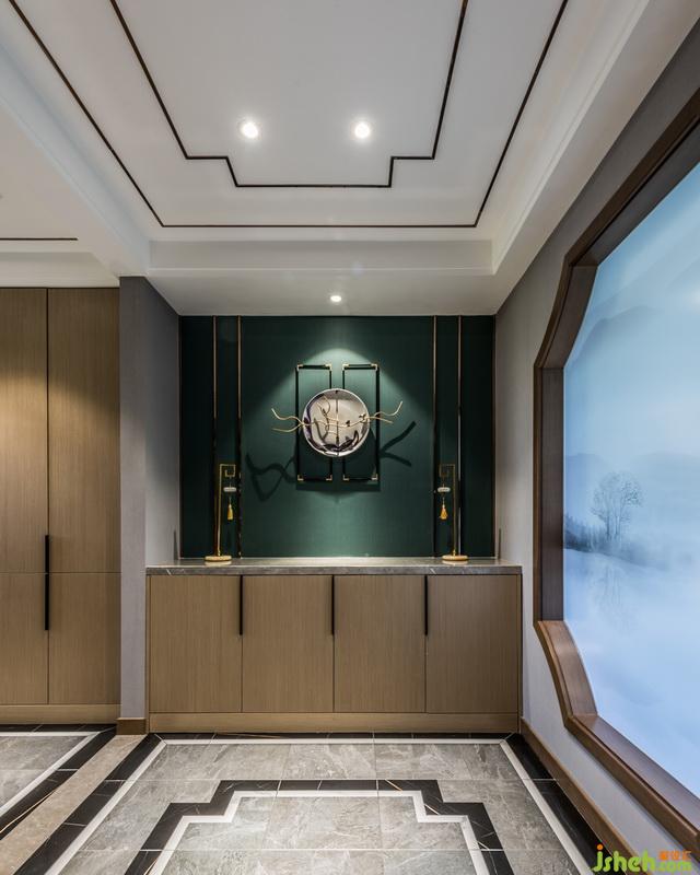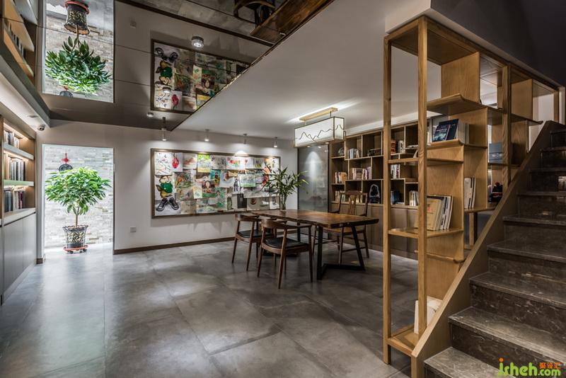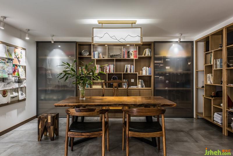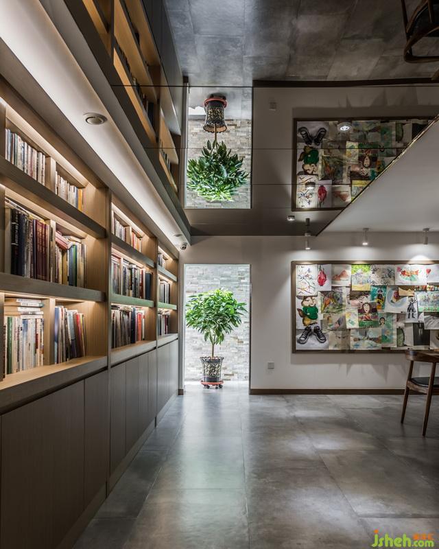 關(guān)于吊頂?shù)脑O(shè)計室內(nèi)設(shè)計師采用了茶鏡,使原來層高比較矮的空間,讓人的感受和視覺有所提升,同時也讓整個書柜里的書鏡像的吊頂上面,形成視覺上的沖擊。